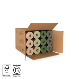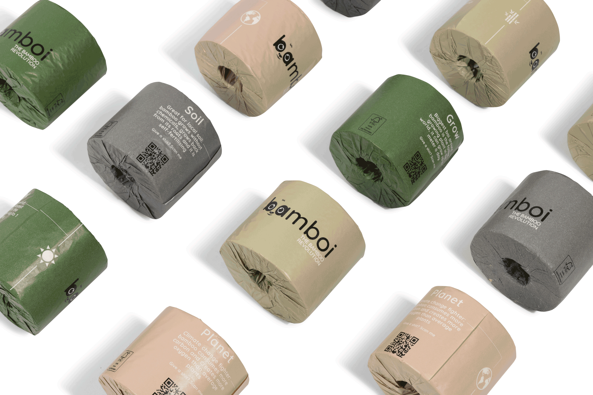 Los rollos están envueltos individualmente en papel de bambú e impresos con tinta vegetal. Las envolturas son biodegradables y constituyen una alternativa sostenible al plástico. Esto mantiene el papel higiénico limpio, higiénico y suave durante el transporte y almacenamiento. Las cajas son de cartón reciclado y sirven como ayuda logística, por lo que las envolturas son el único embalaje.