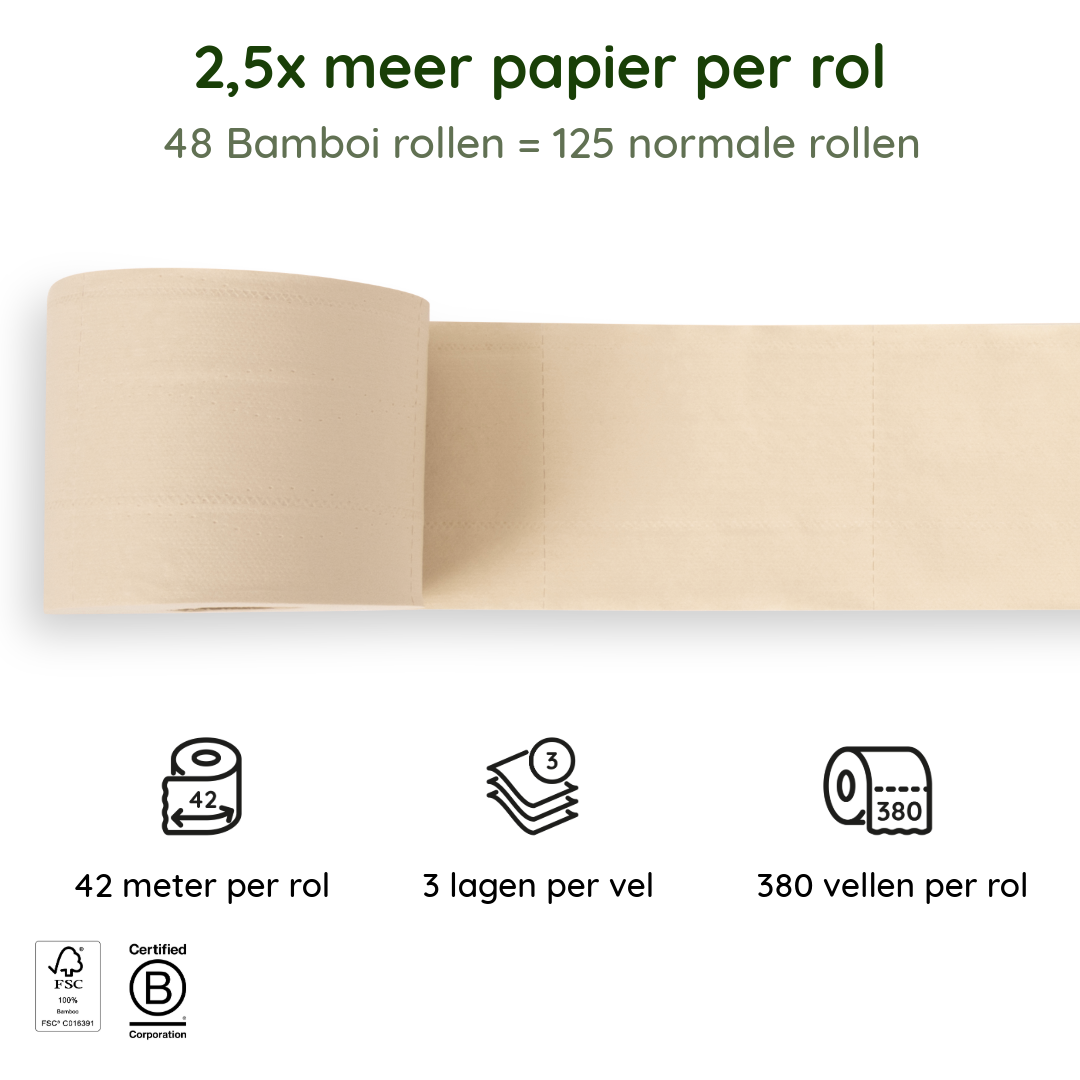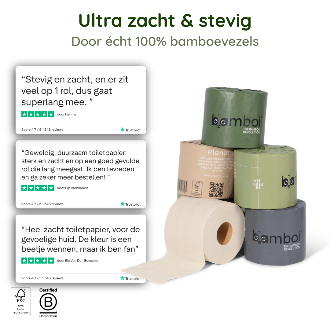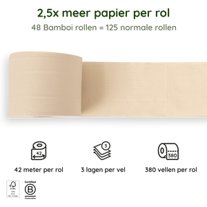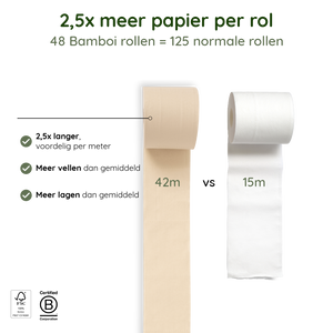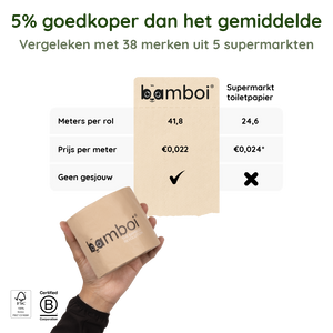 No! Bamboi® is 5% cheaper than average toilet paper. When comparing toilet paper, it's important to look at the number of layers and sheets per roll. With a subscription and including shipping costs, Bamboi® costs €0.94 per roll. That's €0.022/meter compared to €0.026/meter for average toilet paper. Because a roll of Bamboi® is 2.5 times longer, you save more per meter.